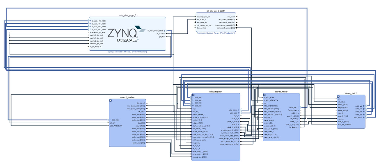 该架构中的立体匹配部分仍延用了上一代 SGM/BM 的设计算法,在保证设计性能的基础上,leyucom智能采用了分块匹配的思想,将左右图像分为可拆分的两部分,分别独立进行匹配,在设计上进一步将 BRAM 资源使用量缩减至 1/2。